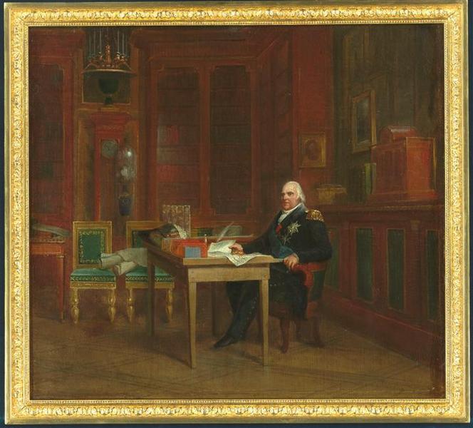 portrait (Louis XVIII, Provence comte de, homme, assis, de trois-quarts, uniforme, Ordre du Saint-Esprit, intérieur, palais, livre, matériel d'écriture, Paris)