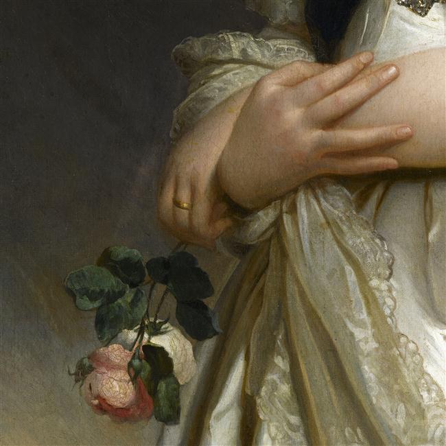 portrait (Victoria, femme, à mi-corps, de trois-quarts, robe, couronne, bijou, Ordre de la Jarretière, rose) ; fond de paysage