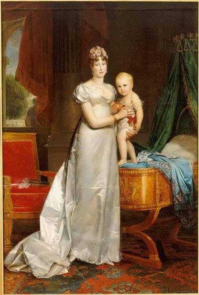 portrait collectif ; Marie-Louise de Habsbourg-Lorraine (Autriche archiduchesse d', Parme grande duchesse de, Plaisance duchesse de, Guastalla duchesse de, femme, en pied, de trois-quarts, robe, bijou, fleur) ; Bonaparte François Charles Joseph Napoléon (Napoléon II, Reichstadt duc de, roi : Rome, nourrisson, en pied, de trois-quarts, lit, siège) ; mobilier