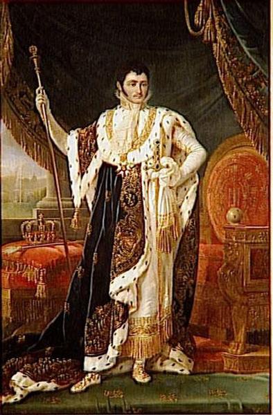 portrait (Bonaparte Jérôme, homme, à mi-corps, de trois-quarts, roi : Rhénanie-Westphalie, amiral, général, habit, manteau : fourrure, Ordre de la Légion d'honneur, couronne, trône, broderie)