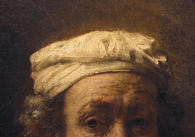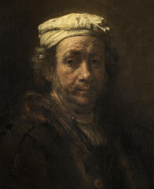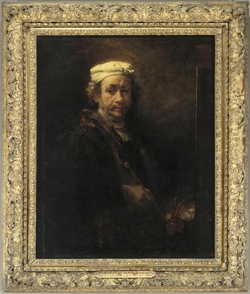 autoportrait (Rembrandt Harmensz Van Rijn, homme, à mi-corps, de trois-quarts, coiffe, chevalet, peintre)