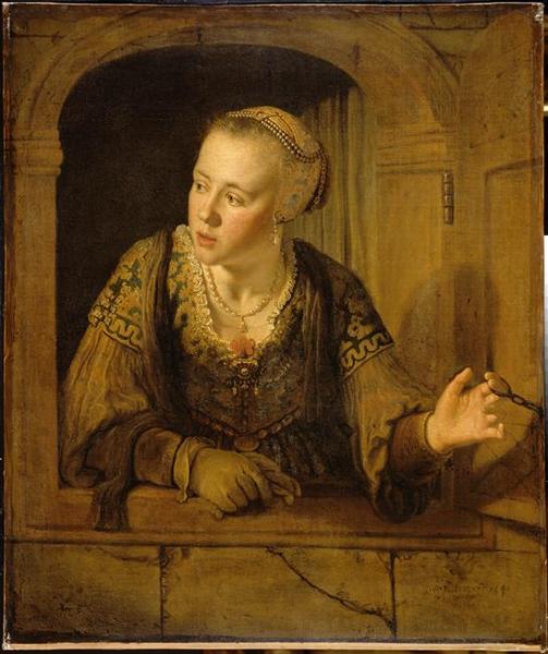 portrait d'inconnu (jeune fille, à mi-corps, de trois-quarts, gant, accoudé, robe, bijou, coiffure) ; fenêtre