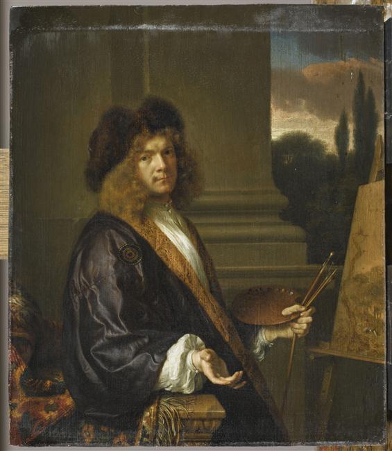 autoportrait (Vois Arie de, homme, à mi-corps, de trois-quarts, vêtement, chapeau, chevalet, peintre) ; pilastre ; fond de paysage