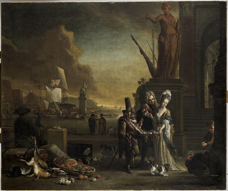 paysage (port, bateau à voiles, marchandises, statue, escalier, quai) ; scène (femme, homme, commerçant, enfant, chien, vêtement, singe) ; nature morte (lièvre, petit gibier, fruit, panier : vannerie)