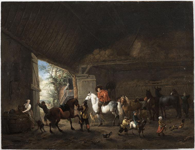 scène (étable à chevaux : intérieur, cheval, cavalier, femme, enfant, volaille, chien)