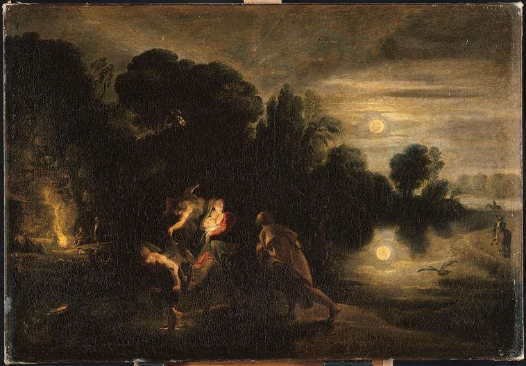 imitation ancienne combinant les personnages de la Fuite en Egypte d'un tableau de Rubens daté 1614, conservé au musée de Cassel (Rooses I 178) , avec un paysage d'Elsheimer tel celui de la Fuite en Egypte conservée à la pinacothèque de Munich