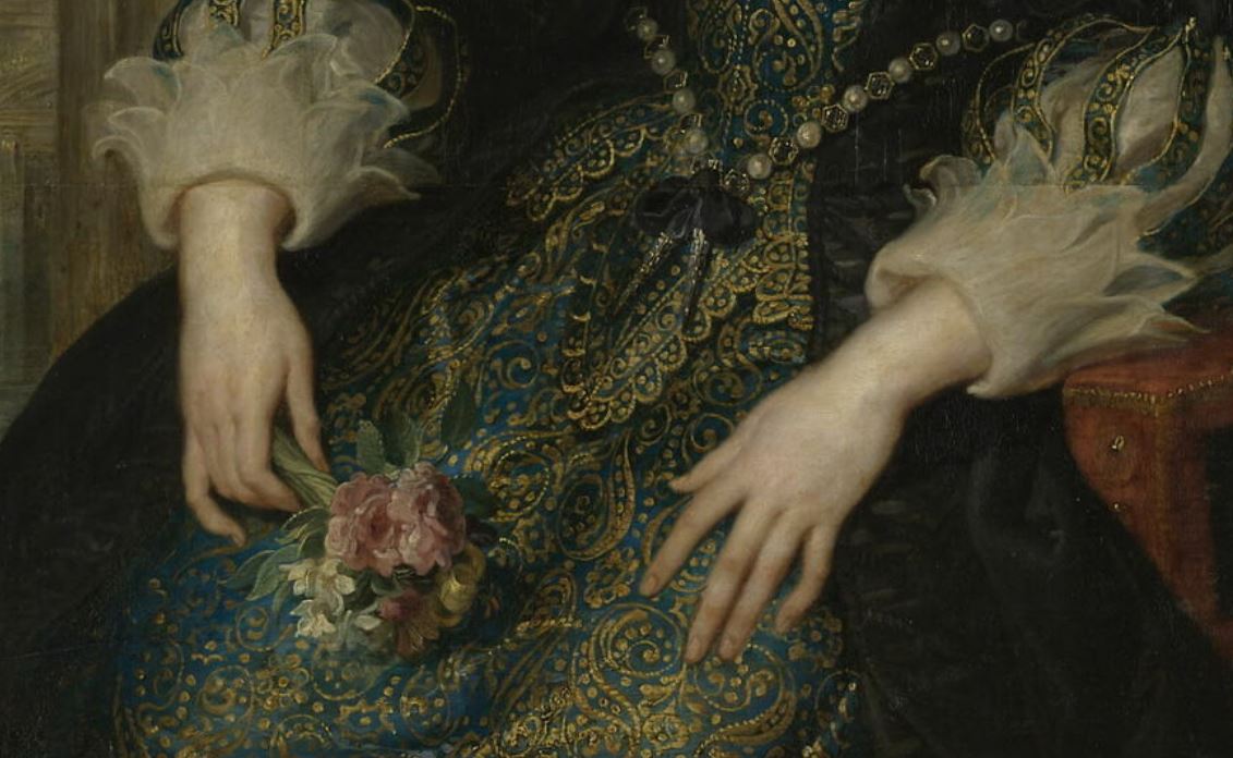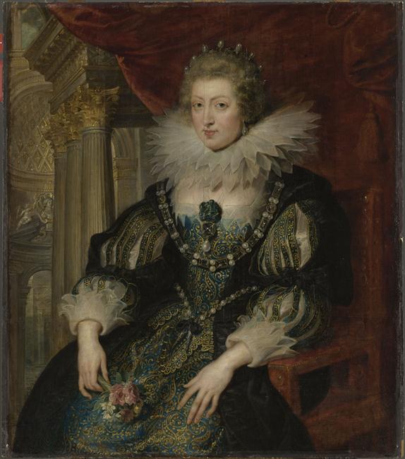 portrait (Anne d'Autriche, femme, assis, à mi-corps, de trois-quarts, col : dentelle, bijou, robe, intérieur) ; élément d'architecture
