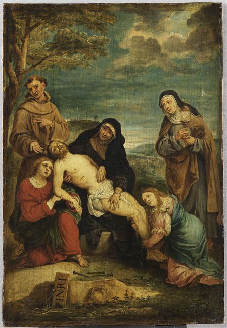 scène biblique (Déploration, Vierge de douleur, Christ mort) ; Les instruments de la Passion ; groupe de figures (saint François d'Assise, sainte Scholastique)