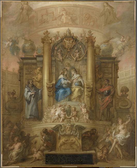 scène historique (Louis XIV, Marie-Thérèse d'Autriche, alliance, allégorie : la paix) ; ornementation (élément d'architecture, armoiries)