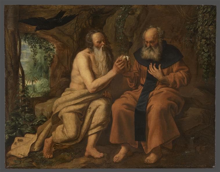 scène biblique (saint Paul ermite, saint Antoine ermite, vieux, corbeau, nourriture, intérieur : grotte)