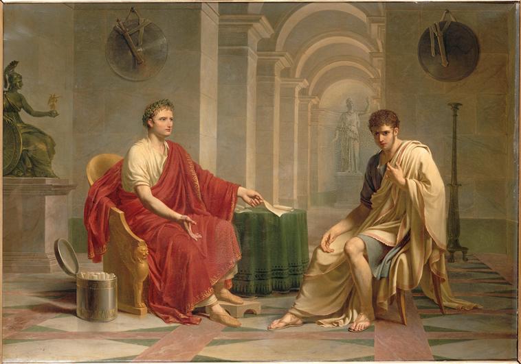 scène historique (Cinna Cneius Cornelius, Auguste, siège, lettre, arcade, statue, conversation, vêtement : à l'antique)