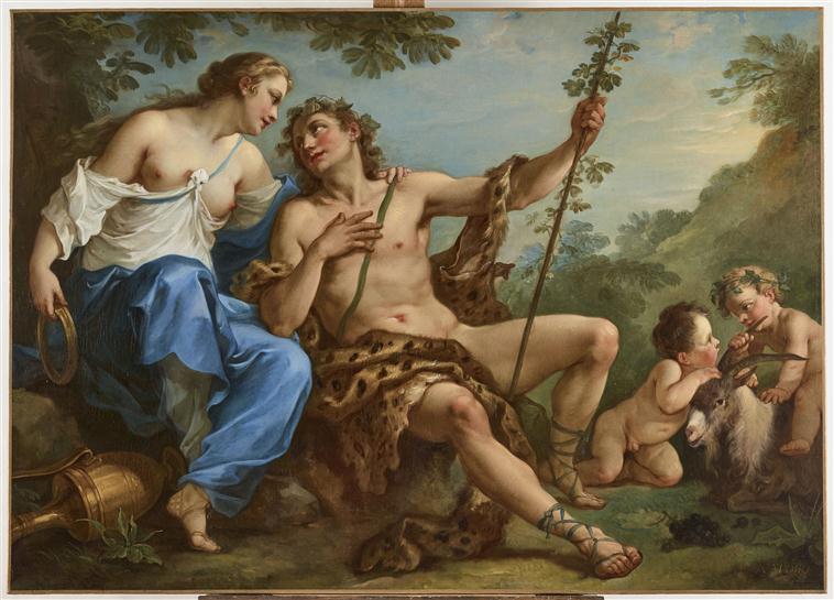 scène mythologique (Bacchus, fourrure, enfant, bouc, raisin, amour, Ariane, nudité, femme, tambourin, couronne : vigne, vase)