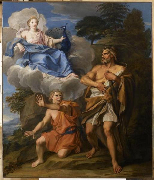 scène mythologique (Junon, paon, Hercule, massue, jeune homme, colère)