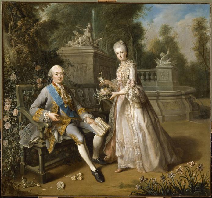 portrait collectif (famille) ; Bourbon Louis Jean Marie de (Penthièvre duc de, homme, assis, de trois-quarts, Ordre de la Toison d'or, livre, habit, rose) ; Bourbon Louise Adélaïde de (Orléans duchesse d', jeune fille, en pied, de trois-quarts, robe) ; jardin (fontaine, sculpture, balustrade, tulipe, rose)