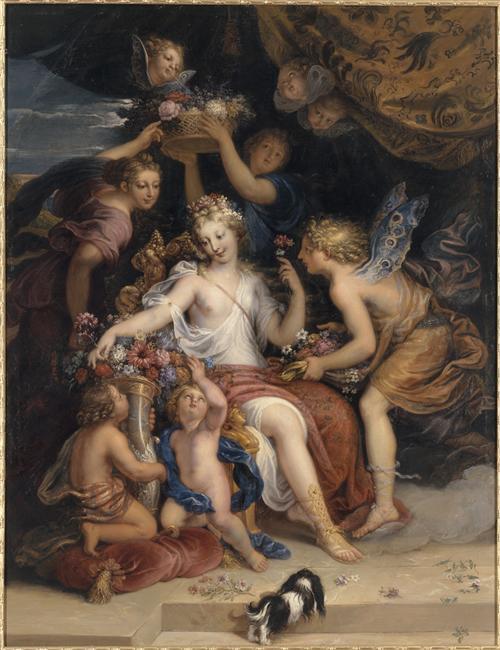 scène mythologique (Zéphyr, Flore, rencontre, fleur, putti, aile, chien)