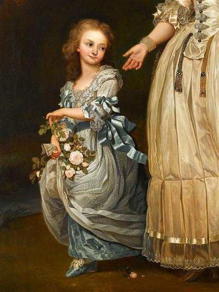 portrait (Marie-Antoinette, femme, en pied, de trois-quarts, dentelle, bijou, chapeau, amour maternel) ; fillette (fleur) ; garçon (chapeau, dentelle) ; jardin (élément d'architecture)
