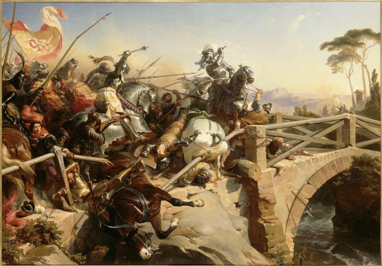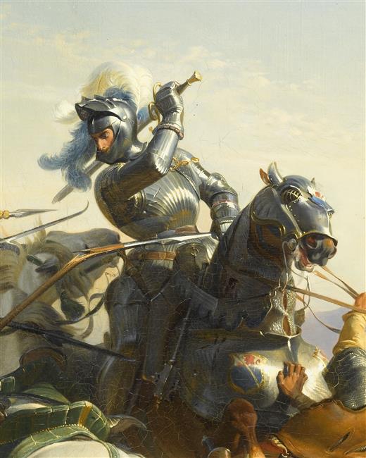 scène historique (bataille, pont, rivière, armure, cheval, caparaçon, blessé, drapeau, épée, lance, chevalier, Bayard)