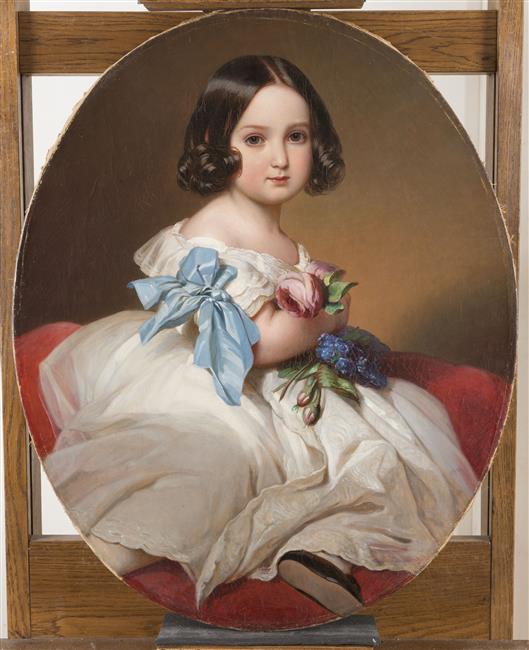 portrait (Charlotte de Belgique, Saxe duchesse de, fillette, assis, de trois-quarts, rose)