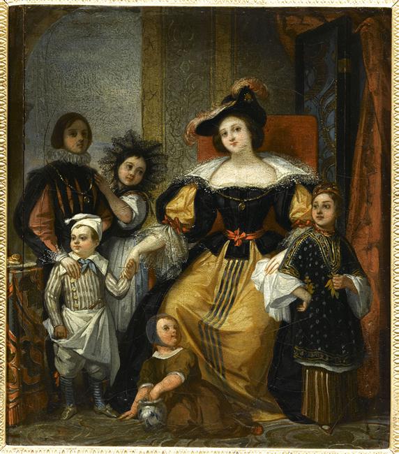 portrait (Deveria Céleste, femme, assis, de trois-quarts, amour maternel, robe, (rayure) ; chapeau ; dentelle ; fillette ; garçon (rayure)