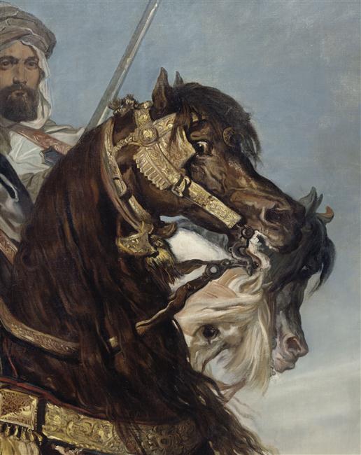 scène ; portrait (Ali ben Ahmed, équestre, homme, Algérien, de trois-quarts, vêtement : à l'orientale, décoration, cheval : harnachement) ; cavalier ; élément d'architecture ; Constantine