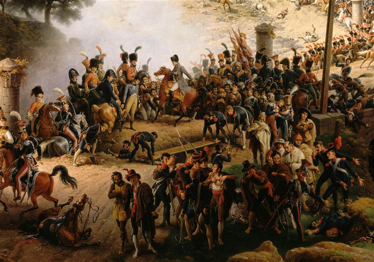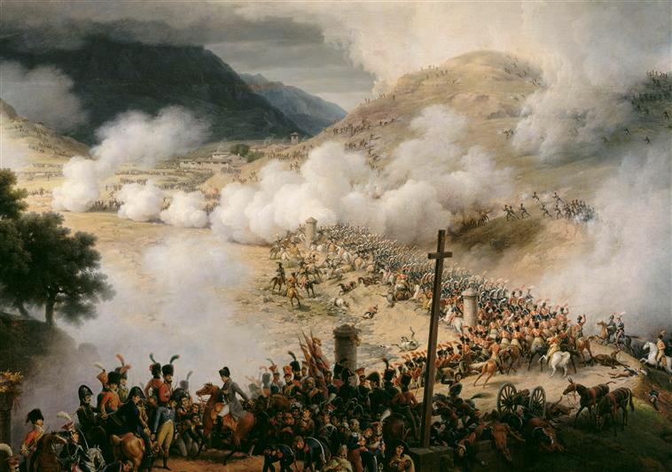 scène historique (bataille, cavalerie, infanterie, blessé, cadavre, habit : armée, Napoléon Ier) ; paysage (montagne, torrent)