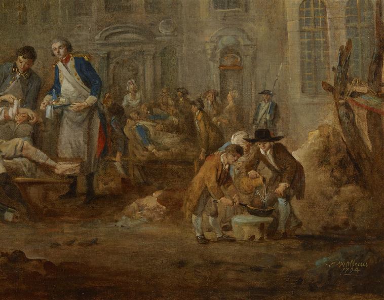 scène (guerre de siège, blessé : soin, peur, repas) ; ville (Lille : place, église)