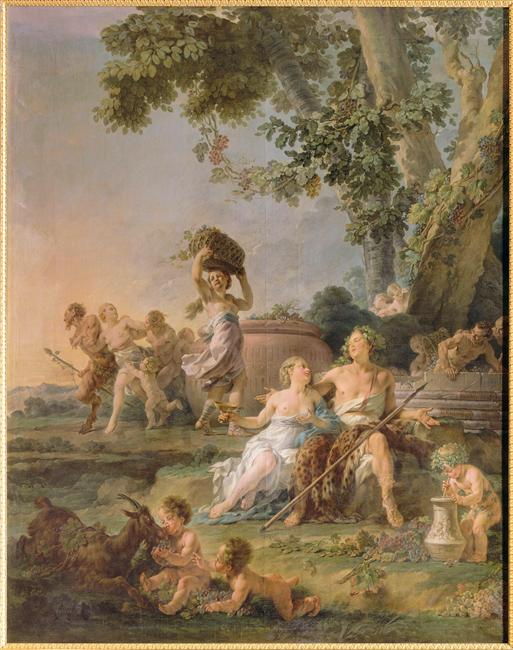 scène mythologique (vendange, automne, nymphe, satyre, Bacchus, raisin, chèvre, enfant, beuverie, machine agricole)