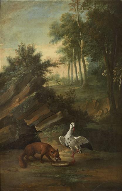 scène (satirique, renard, cigogne, paysage, repas)