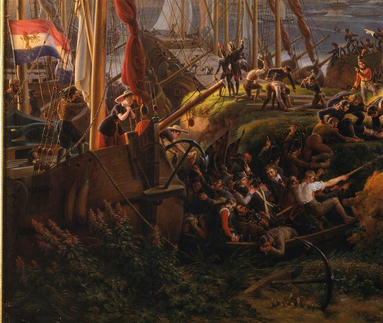 scène historique (Rhin, barque, bateau à voiles, soldat, Kléber Jean-Baptiste, Jourdan Jean-Baptiste comte, drapeau, palissade, embarcadère)