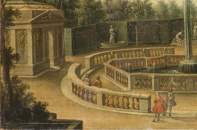 vue d'architecture (décor de jardin, jet d'eau, statue, balustrade, promenade)