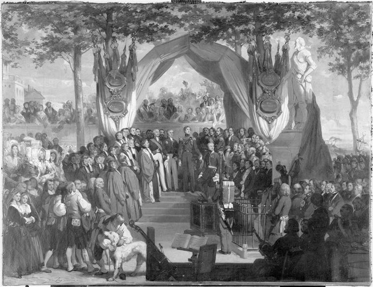 scène historique (statue : Henri IV, Montpensier duc de, foule, drapeau, musicien, violoncelle, inauguration, chien, magistrat)