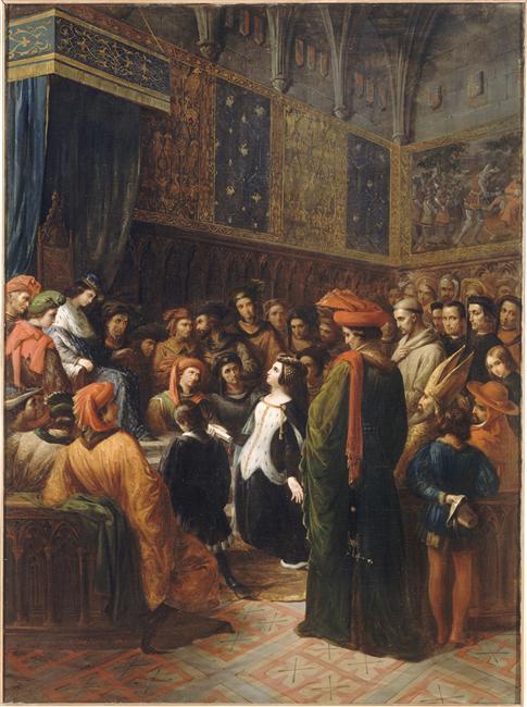scène historique (Charles VI, trône, Milan Valentine de : agenouillé, homme, enfant, évêque, peinture)