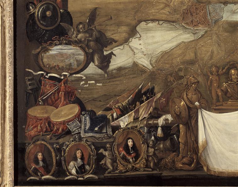 scène historique (ville : Valenciennes, fortification, guerre de siège, Autriche Juan d' : secours) ; allégorie (triomphe, Autriche Juan d' : en buste, putti, drapeau, peinture, armoiries)