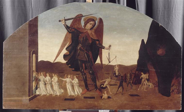 scène biblique (saint Michel, Pèsement des âmes, balance, armure, paradis, Enfer, diable)