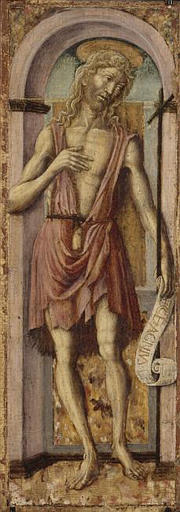 figure biblique (saint Jean-Baptiste, homme, en pied, de trois-quarts, phylactère) ; figure biblique (Annonciation, partie de, ange) ; cadre urbain ; Dieu le père ; main