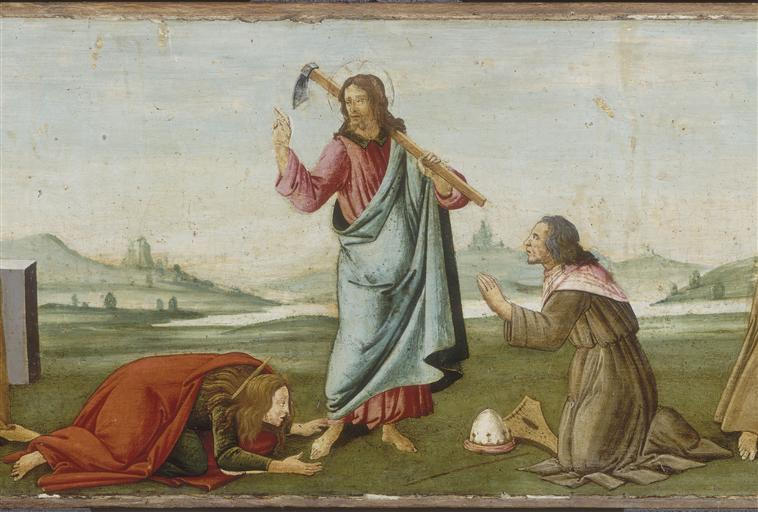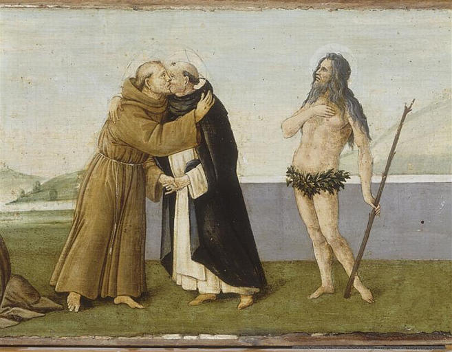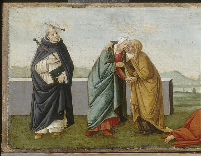 scène biblique (Apparition à Madeleine) ; scène biblique (Visitation) ; scène biblique (saint François d'Assise, saint Dominique de Guzman, rencontre) ; figure (saint Pierre : martyre) ; figure (David) ; figure (saint Onuphre, ermite) ; fond de paysage