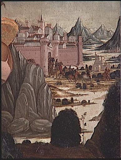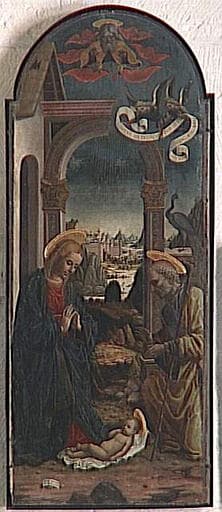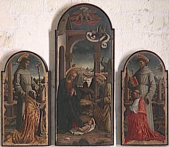 commandé par Giuliano della Rovere pour la chapelle funéraire de la famille Rovere en l'église San Francesco de Savone ; autres éléments : couronnement (calvaire) à la pinacoteca de Savone, prédelle (fuite en Egypte) autrefois dans la collection Benedict à Paris