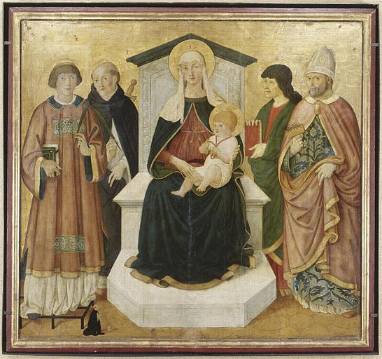 figures bibliques (Vierge à l'Enfant : en majesté, assis, trône, fauteuil, de face) ; groupe de figures (saint Laurent diacre, saint Pierre, saint Jean, saint Blaise de Sébaste, en pied) ; portrait (en donateur, homme, évêque : dominicain, de profil, dévotion à la Vierge)