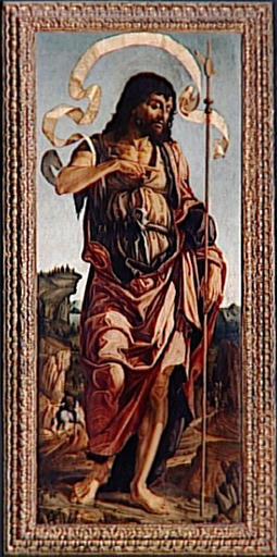 figure biblique (saint Jean-Baptiste, homme, en pied, de trois-quarts, croix, phylactère) ; fond de paysage (falaise, cavalier)