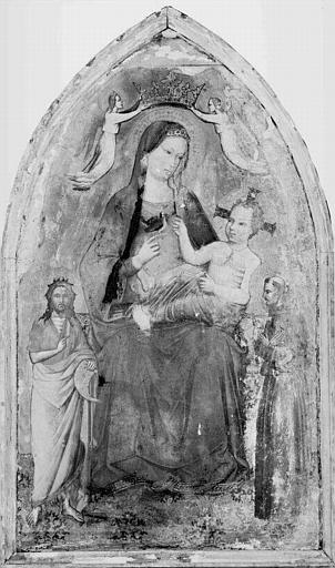 figures bibliques (Vierge à l'Enfant : en majesté, couronne, ange) ; figure biblique (saint Jean-Baptiste, homme, en pied, de trois-quarts, phylactère) ; figure (saint François d'Assise, homme, en pied, de profil, dévotion à la Vierge)