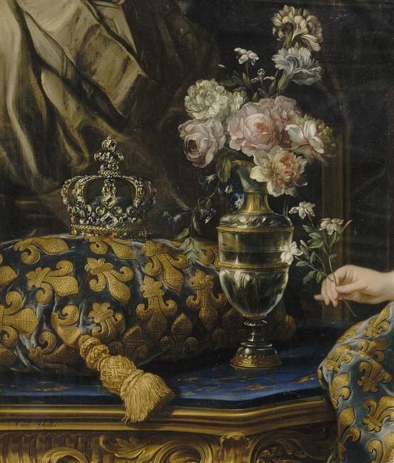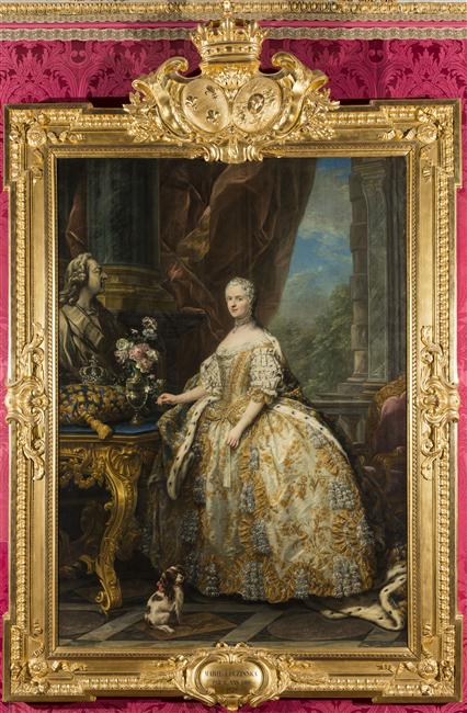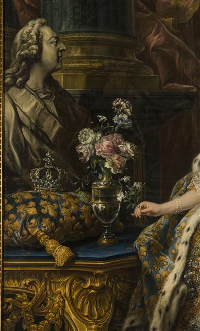 portrait (Marie Leczinska, femme, en pied, de trois-quarts, robe, bijou, fourrure, éventail) ; fleur ; chien ; couronne ; sculpture (Louis XV : en buste)