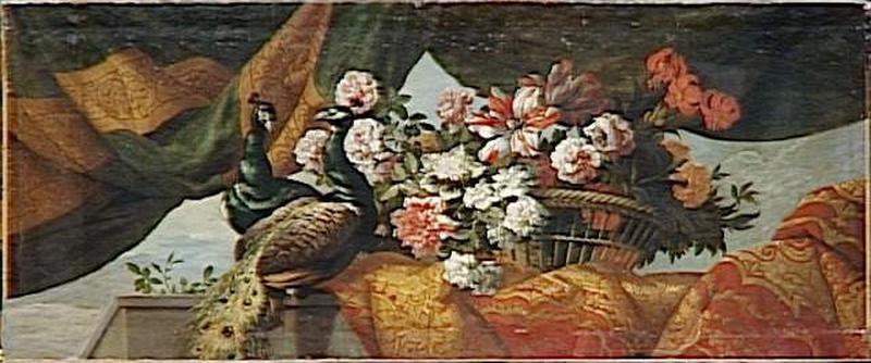 nature morte (vannerie, fleur, rose, tulipe, paon)