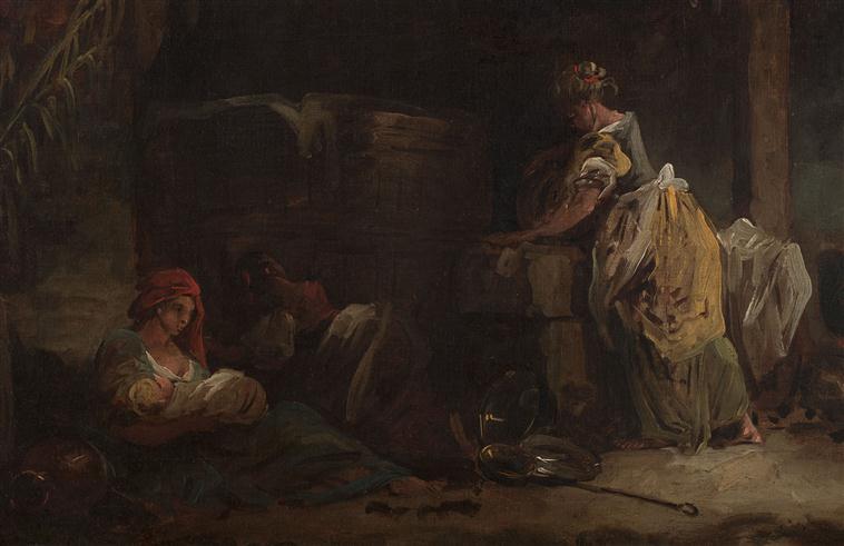 vue d'architecture (palais : intérieur, Rome, de fantaisie) ; scène (préparation des aliments, feu, femme, récipient, engrangement, homme)