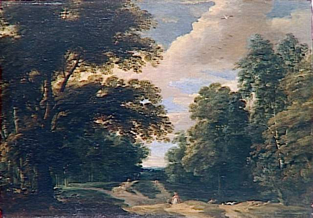 paysage (forêt, chemin, homme, femme, charrette) ; chasse (cavalier, lièvre)