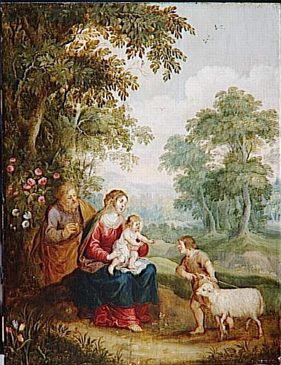 scène biblique (Sainte Famille, saint Joseph, Vierge : assis, Enfant Jésus, saint Jean-Baptiste, mouton) ; paysage (forêt, rocher, pêcher, rosier, tulipe)