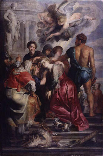 tableau donné à l'église Sainte-Catherine à Lille par Jean de Sueur et Marie de Patyn pour le maître-autel de l'église ; étude pour une sainte Catherine conservée à l'Albertina de Vienne ; copie vers 1734 en l'église Saint-Bavon de Gand ; dessin du bourreau attribué à W. van der Leeuw au cabinet des dessins du musée de Cassel ;