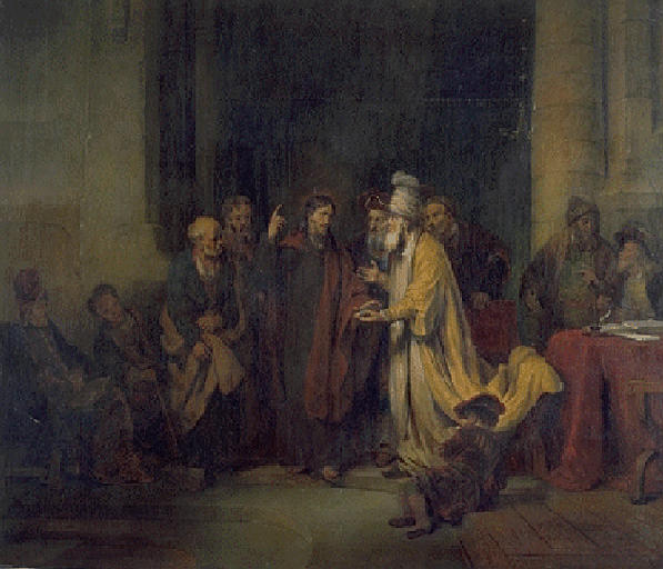 scène biblique (Le denier de César) ; homme (discussion, écriture, instrument d'écriture : plume, encrier, enfant, lecture)