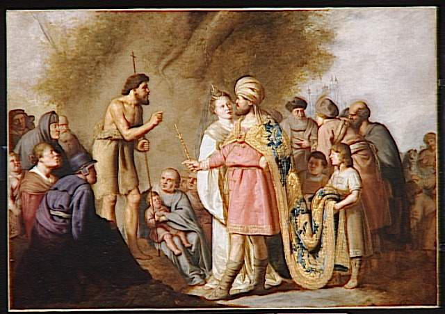 scène biblique (saint Jean-Baptiste, Hérode, Hérodiade, reproche, inceste) ; attribut de la royauté ; soldat (arme)