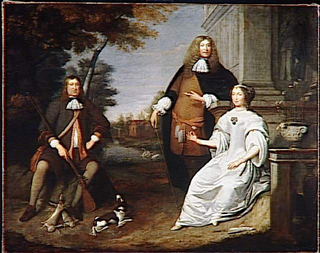portrait collectif (femme : assis, de trois-quarts, oeillet, homme : en pied, canne, homme : chasse, assis, de face, lièvre) ; éventail ; élément d'architecture (statue) ; vase (sculpture : putti) ; mare (cygne) ; arbre