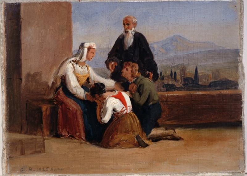 scène (vieux, femme, assis, jeune homme, jeune fille, agenouillé, repentir, désespoir, terrasse) ; fond de paysage (montagne, cyprès)